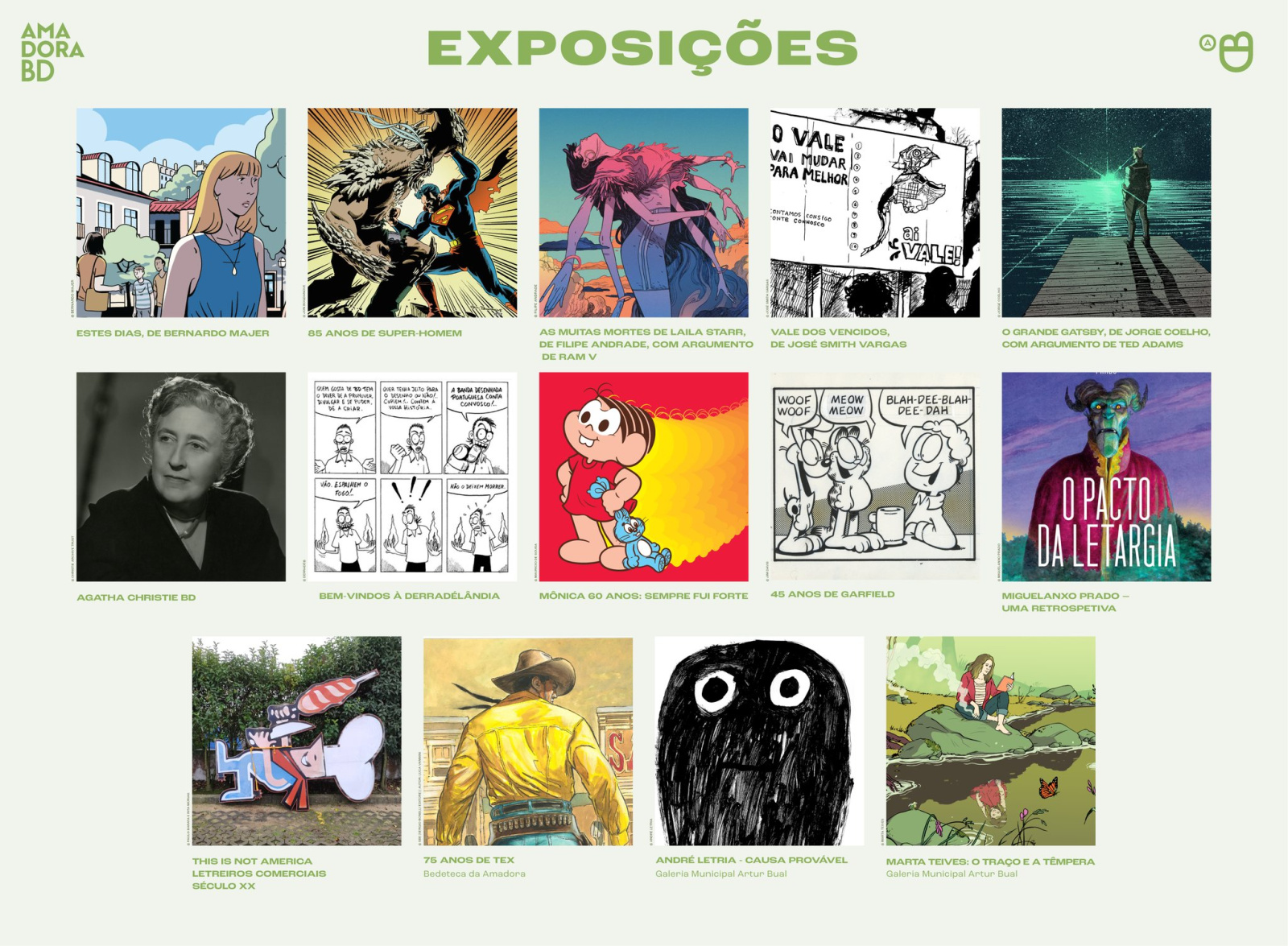 Este ano os grandes clássicos não faltam e até domingo podes ver em detalhe, a exposição "Estes dias" de Bernardo Majer, o vencedor do Prémio BD do ano passado, a exposição "85 anos de Super Homem", a exposição "Garfield 45 anos", a exposição "Agatha Christie na BD", "75 anos de Tex", entre outras como podes ver na imagem em baixo